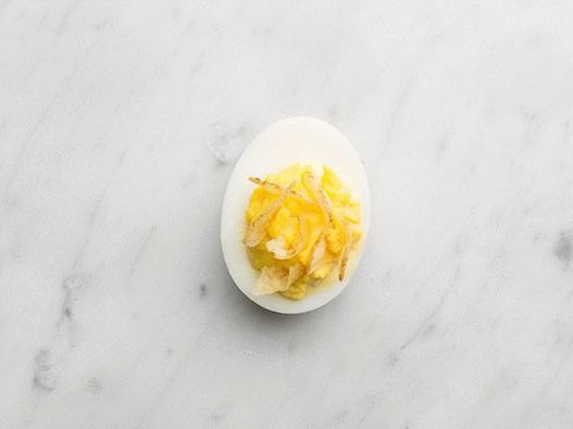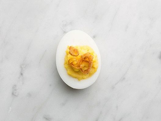 Ozdobte klasická plněná vejce smaženou cibulkou.