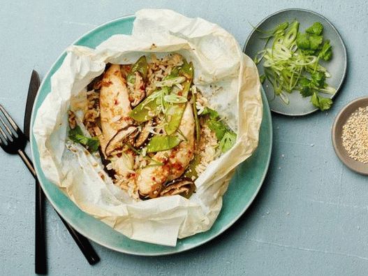 Přidejte kuře s asijskou marinádou styl. Pečené maso v pergamenu s hráškem a žampiony. shiitake, zachováváte šťavnatost a chuť jídla bez nadbytečného tuku a kalorií. Recept: Kuřecí řízek se zázvorem a zelenou cibulkou пергаменте